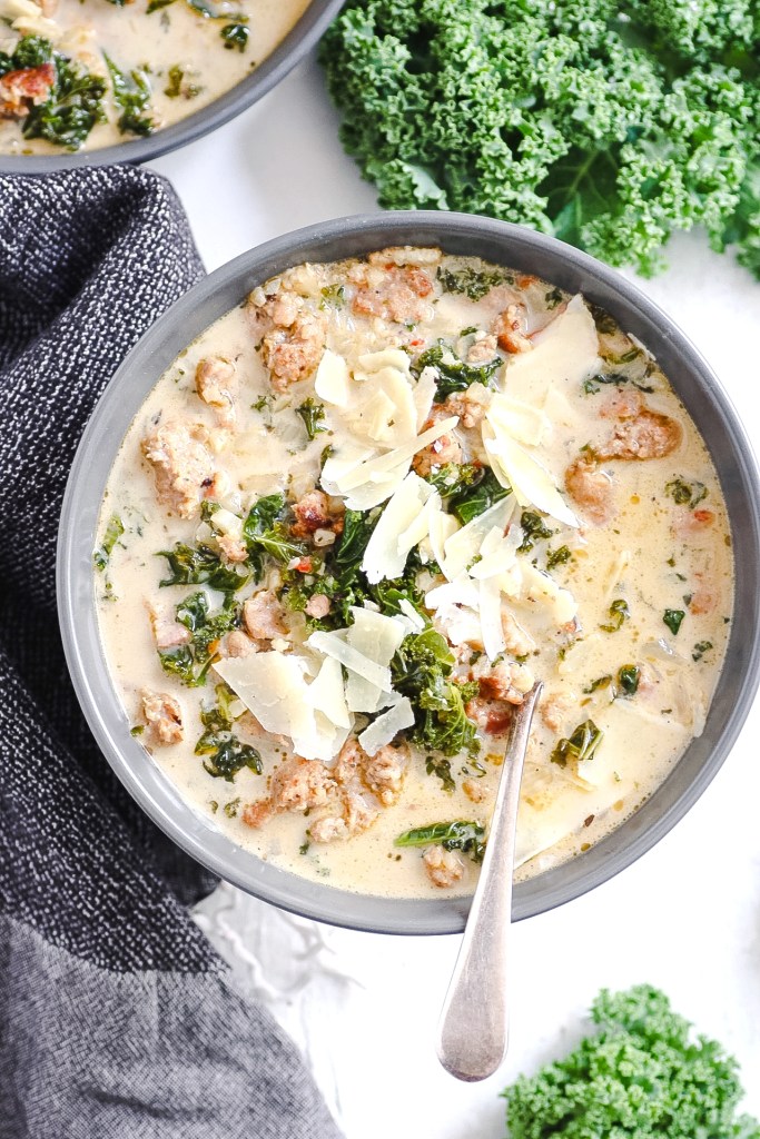 Zuppa Toscana literally translates to "Tuscan soup". Made popular by The Olive Garden restaurant, it combines bacon, ground Italian sausage, potatoes, Tuscan kale, and parmesan to make a soup that is hearty and intensely flavorful. Zuppa Toscana was the darling of The Olive Garden's "soup and salad" lunch special. People just had to figure out how to make Zuppa Toscana at home because it was a favorite at the restaurant!