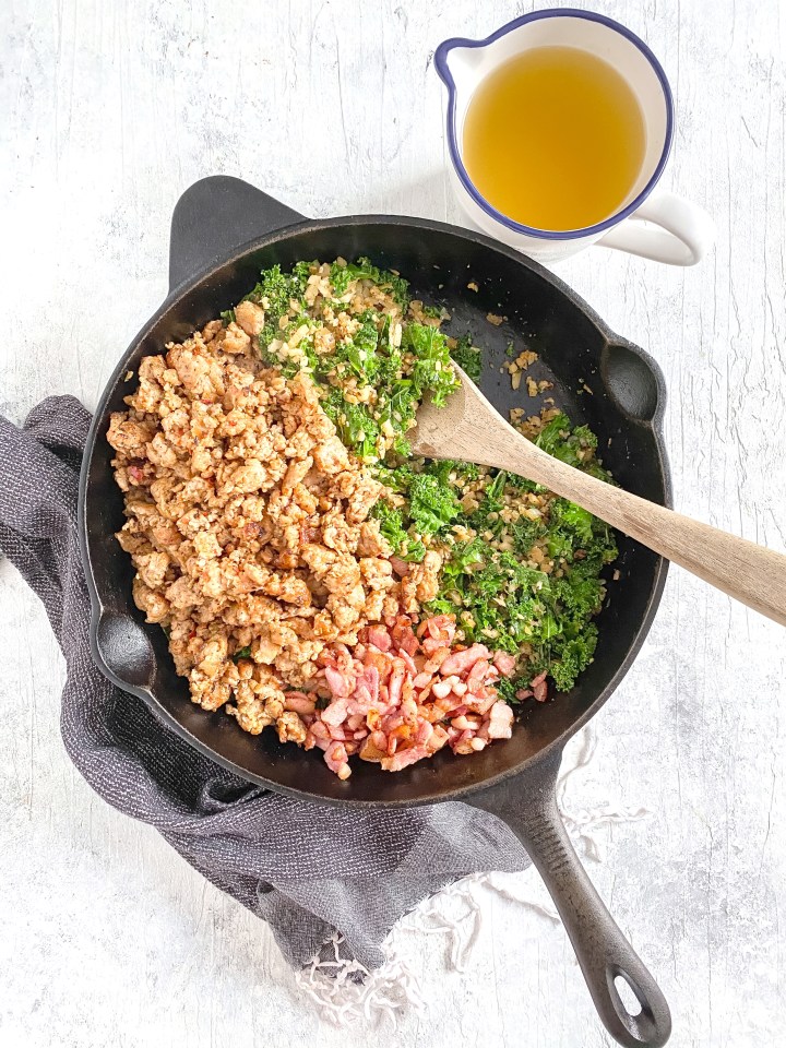 Step 3: Add the cauliflower rice, chopped kale, and Italian seasoning. Mix until well incorporated and cook until softened. Now it's time to add the bacon and Italian sausage back to the pan!
