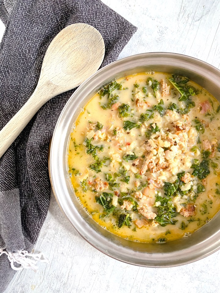 So how did I make Zuppa Toscana keto? Easy! By replacing the potatoes with cauliflower rice, this Keto Zuppa Toscana is full of all the classic flavors but without the carbs, and with clean ingredients and a whole lot of nutritious veggies. That means that this keto Zuppa Toscana is full of good stuff to fuel your brain!